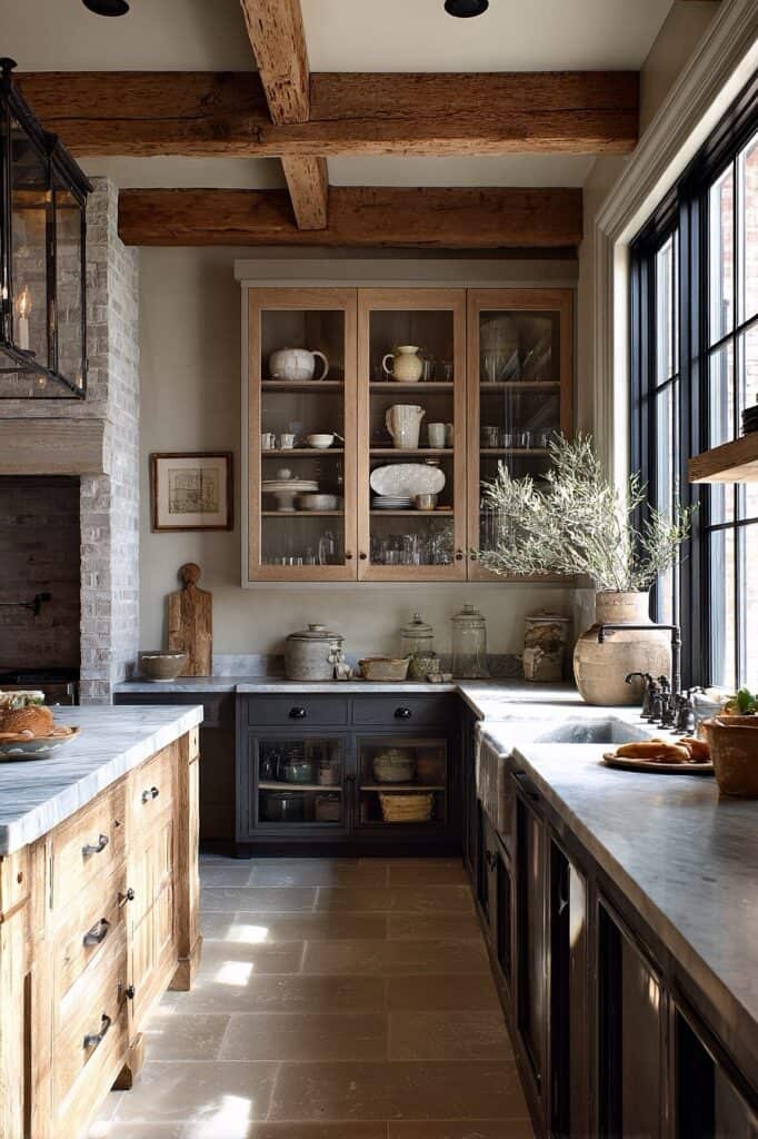 Whether it’s a butcher block island, exposed ceiling beams, or open shelving, dark stained wood brings a natural complexity to the palette. It adds grain and texture that solid paint colors can’t provide. This layer of wood ensures the space feels “livable” and rooted in nature, rather than like a sleek, untouchable showroom.