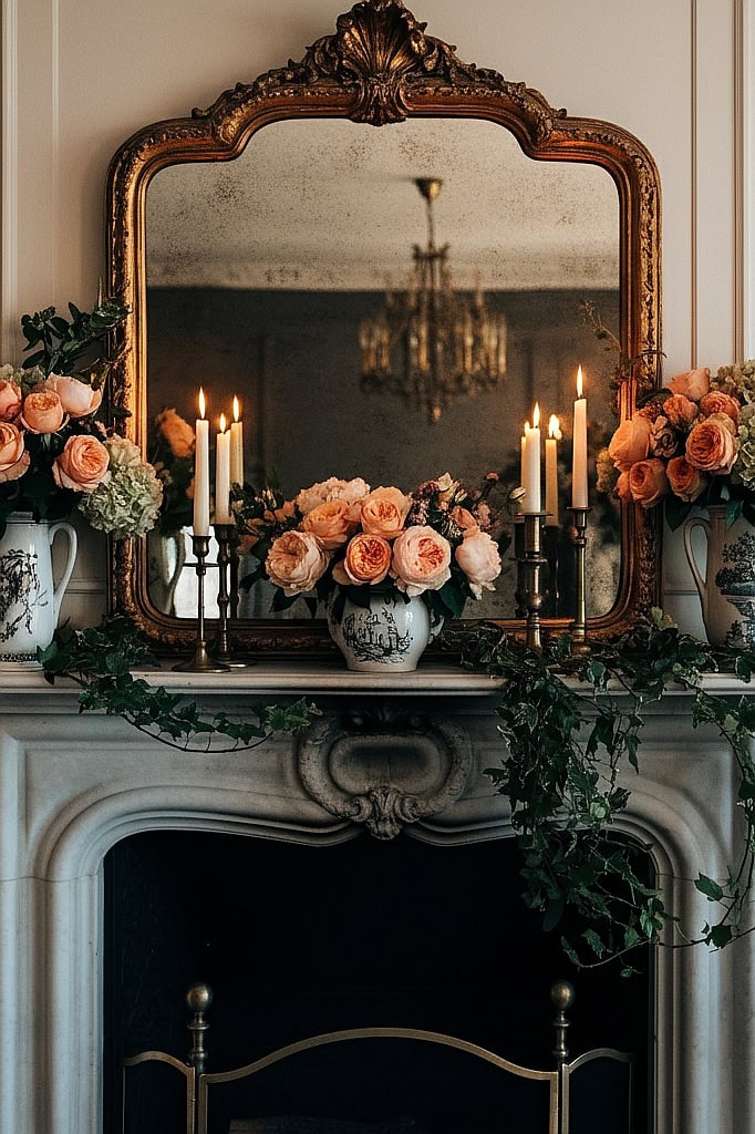 - Elements: Use a large, ornate mirror or a framed botanical print as your anchor. Arrange bouquets of fresh or high-quality faux flowers like roses, peonies, and hydrangeas in vintage-style pitchers or ceramic vases. Add a few tapered candles in brass or silver holders for a touch of elegance.