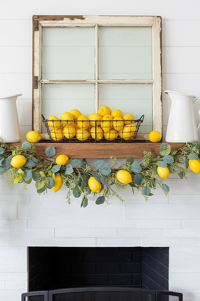 - Styling Tip: Weave a lemon and eucalyptus garland along the length of your mantle. It’s a beautiful way to add color and texture. I love how the vibrant yellow pops against the rustic wood or white shiplap common in farmhouse decor.