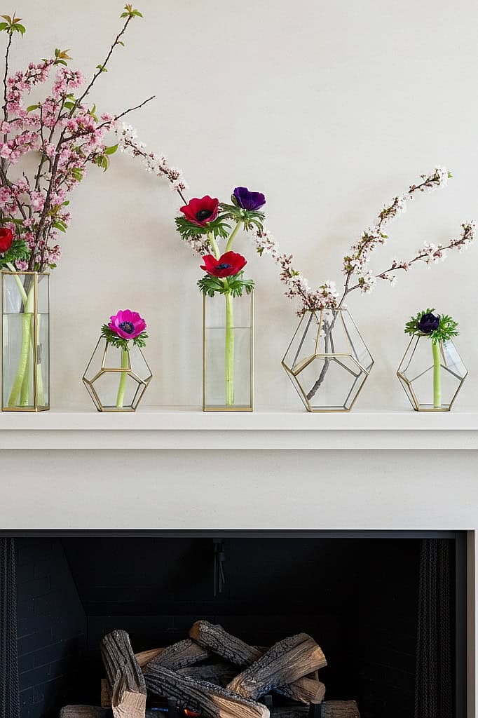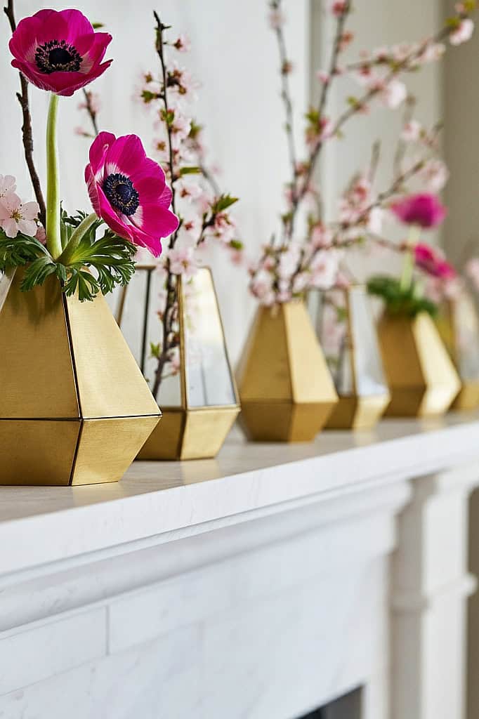 - Elements: Use geometric metal vases, terrariums, or decorative objects in gold, rose gold, or black. Fill them with single stems of bold flowers like anemones, ranunculus, or even a simple cherry blossom branch.