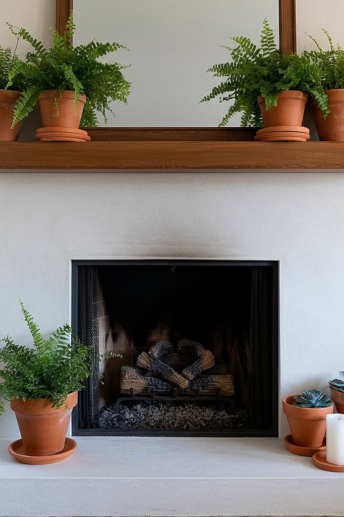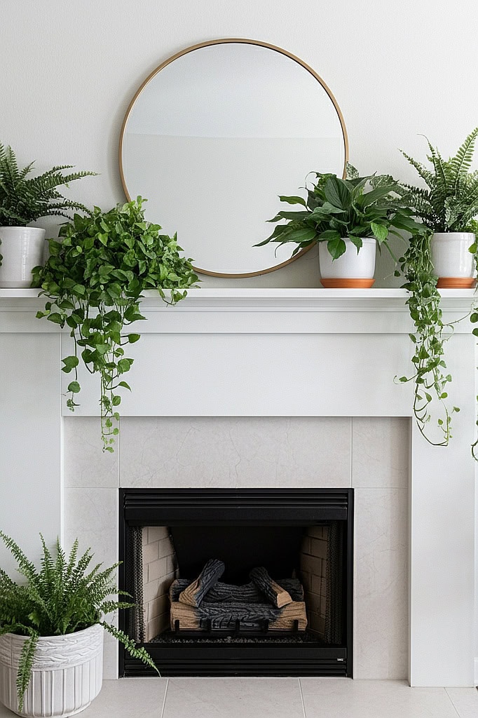 - Styling Tip: Create a “jungle” effect by clustering plants of varying heights. Let trailing plants spill over the edge of the mantle to soften the lines. This living display will change and grow throughout the season.