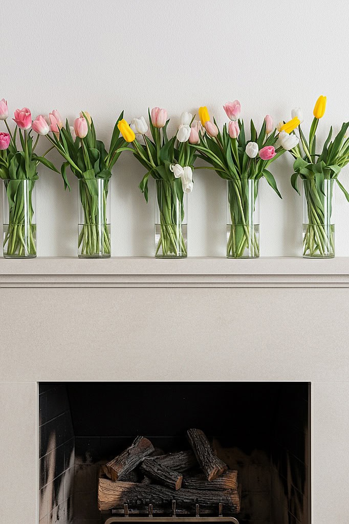 - Styling Tip: Line up five to seven simple glass vases across the mantle, each holding a few tulip stems. This creates a clean, modern, and impactful display. If you’re using fresh tulips, remember they will continue to grow and bend towards the light, which adds to their natural charm.