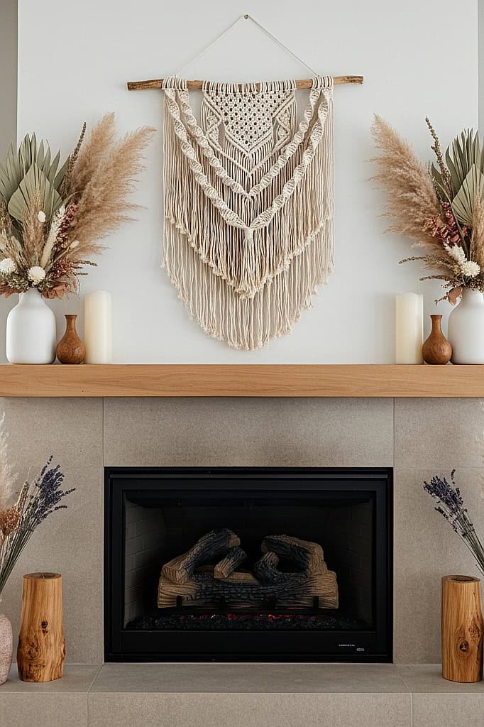 - Elements: Use a large macrame wall hanging as the centerpiece. Arrange dried florals like pampas grass, bunny tails, palm spears, and dried lavender in textured ceramic or amber glass vases. Add a few chunky wooden candle holders.