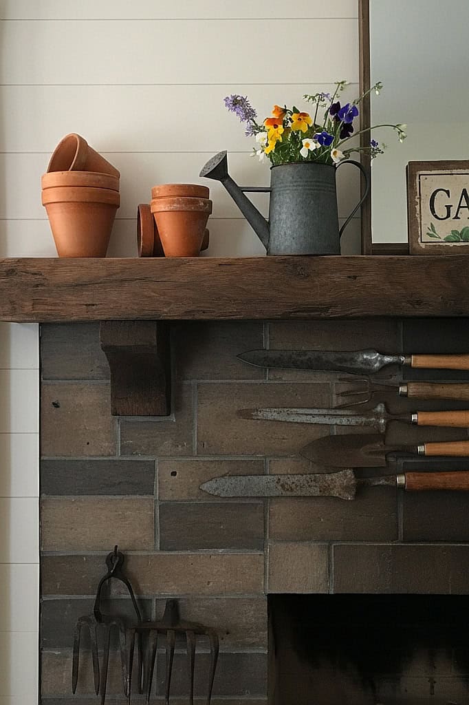 - Elements: Hunt for old trowels, wooden-handled hand rakes, and rustic terracotta pots at flea markets or antique shops. A small, aged watering can makes a perfect vase for wildflowers or fresh herbs like lavender and rosemary.